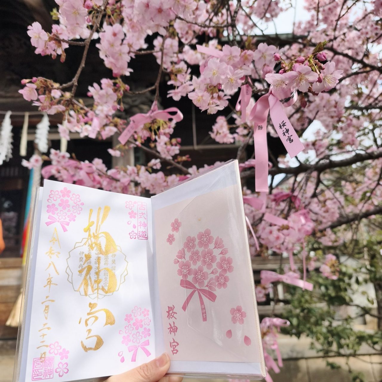 白い御朱印帳に、『河津桜御朱印』を。