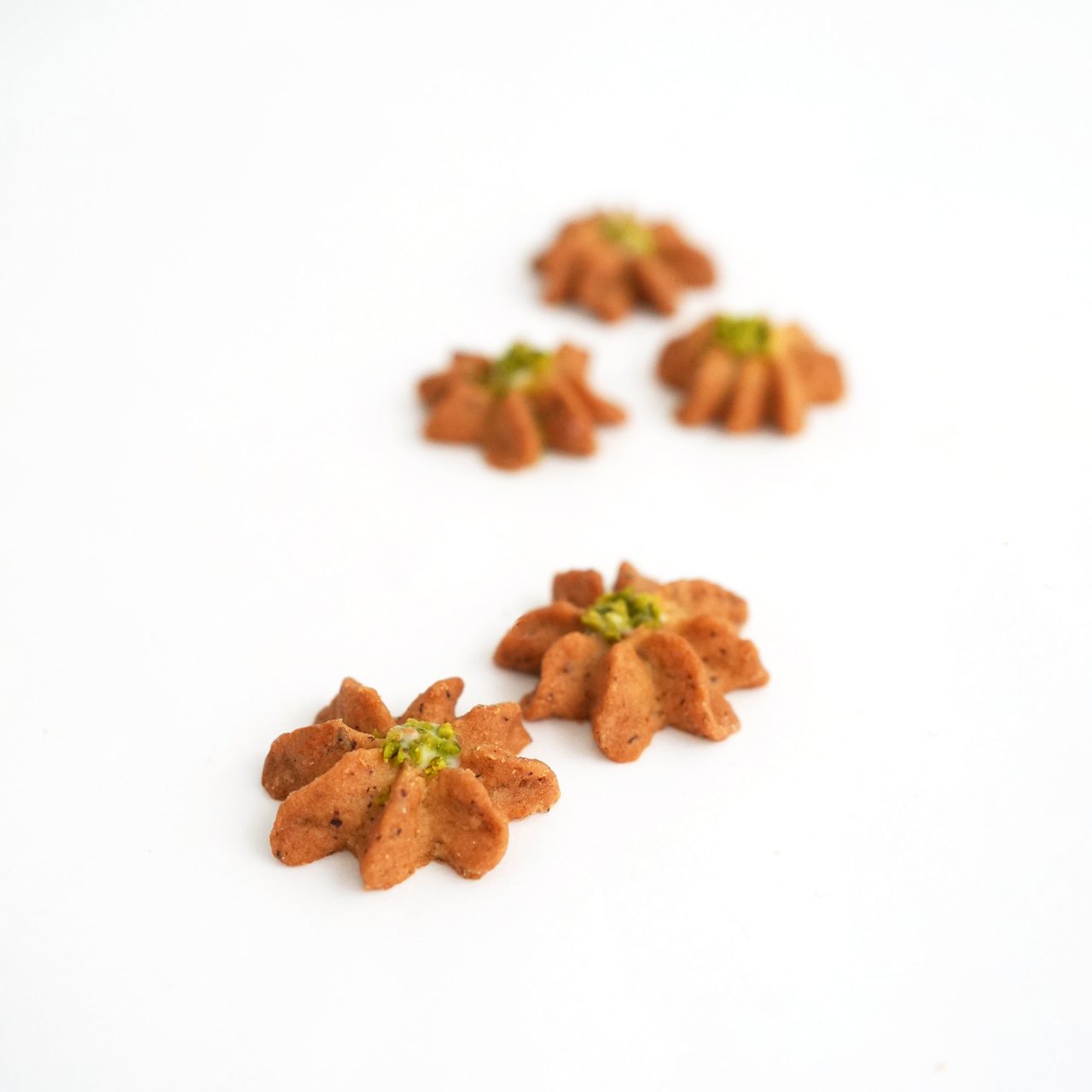 かわいいお花型の絞り出しサブレ。皮付きの香り高いヘーゼルナッツパウダーをたっぷり使い香ばしく焼き上げた、小さいながらもコクのある軽い食感のサブレです。
