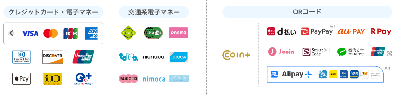 ※現金はご利用いただけません。クレジットカード、電子マネー、交通系電子マネー、QRコードが各種ご利用いただけます。